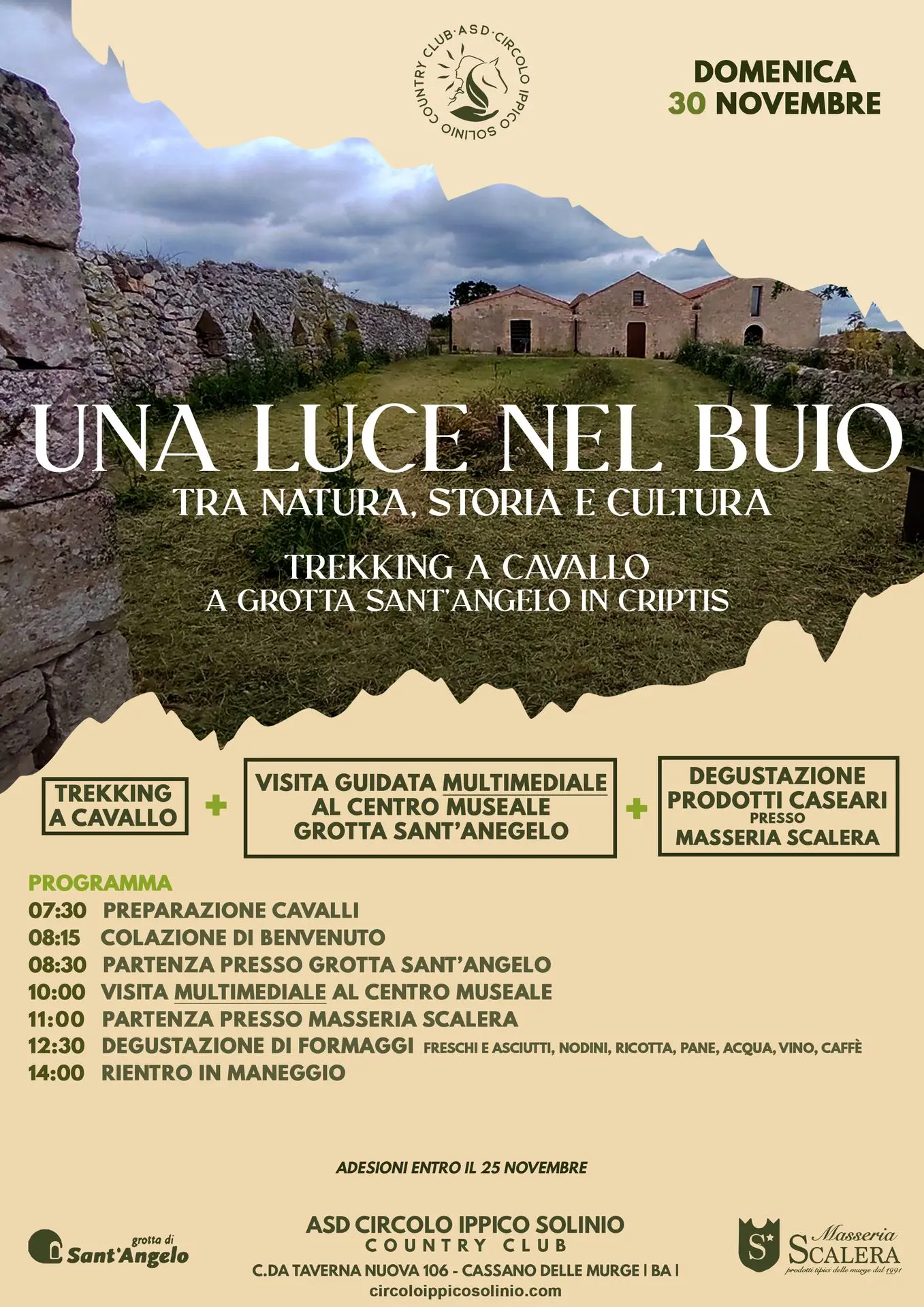 Dopo la visita si riprenderà a cavalcare verso la storica Masseria Scalera per assaporare il gusto dei suoi prodotti caseari e guidare i palati alla estimazione di sapori primitivi e genuini attraverso la degustazione di formaggi freschi e asciutti, latticini e un buon bicchiere di vino